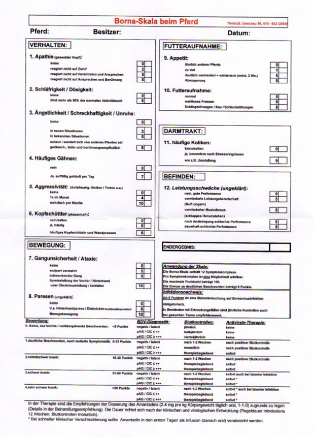 Verhalten: wenn Ihr Pferd auffällige Änderungen seines Verhaltens zeigt ( Apathie, Schläfrigkeit, häufiges Gähnen, Ängstlichkeit, Panik, Zwangsbewegungen, manchmal aggressives Verhalten, Vergessen von Gelerntem, allgemeine Leistungsschwaäche)